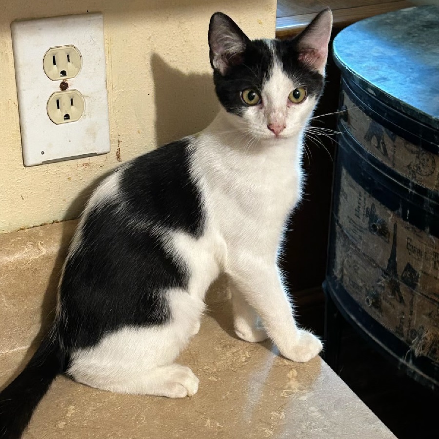 CLOVER 6 month old male. ![]() ![]() Clover showed up in a friend's yard at 5-6 weeks old. Linda took him in immediately. His black and white coat is unique and very soft. His attitude is a bit laid back, but he absolutely loves to be petted and paid attention to. He is best buds with Sandy. |